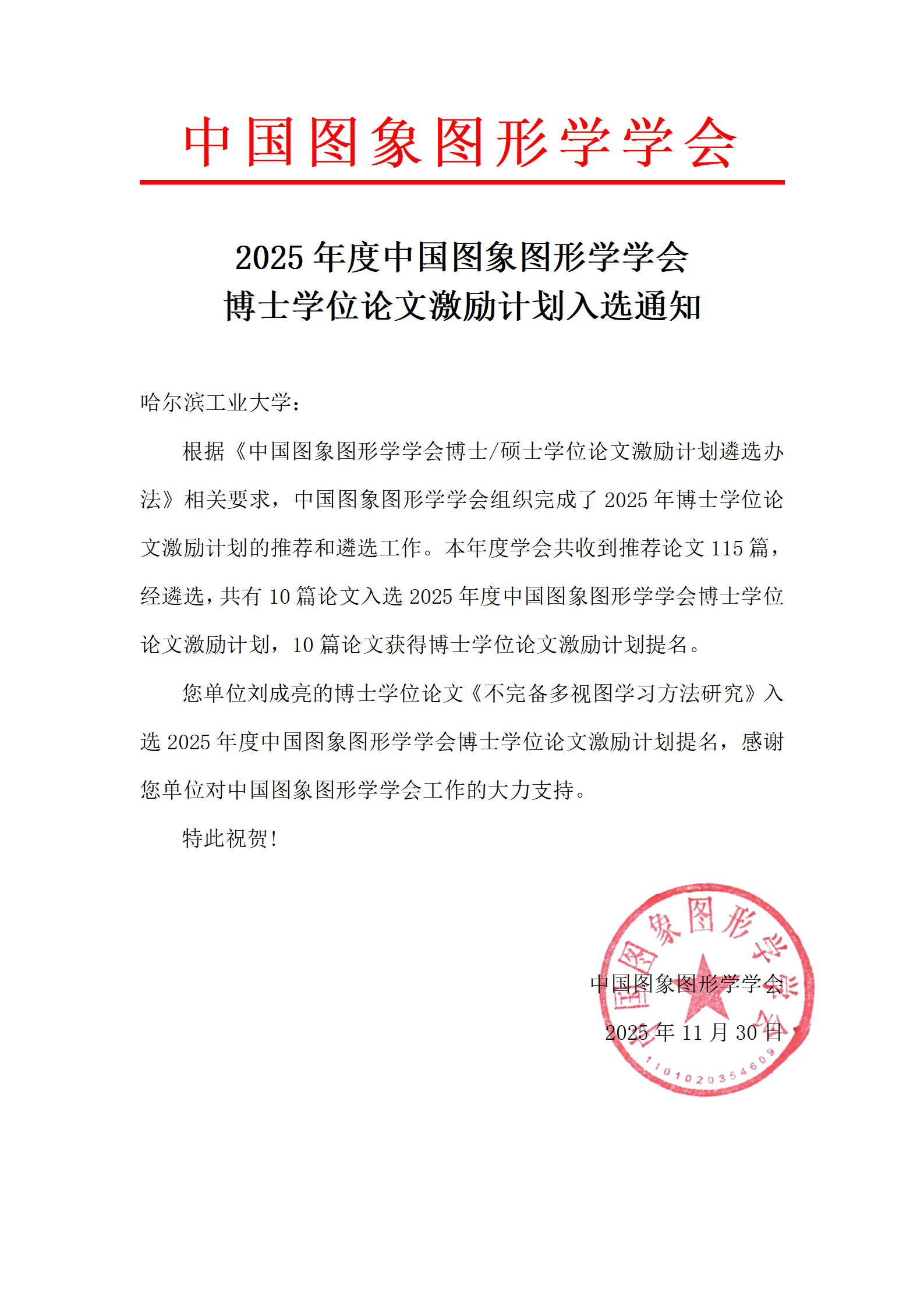 据2025年度中国图象图形学学会(CSIG)博士学位论文激励计划正式公布的提名名单,计算机科学与技术学院博士毕业生刘成亮提交的博士学位论文《不完备多视图学习方法研究》成功入选。中国图象图形学学会(简称CSIG)成立于1990年,是经国家民政部批准成立的国家一级学会,也是中国科学技术协会正式团体会员。CSIG博士学位论文激励计划旨在遴选中国图像图形学领域具有突出创新价值的博士学位论文,重点表彰在图像图形及相关领域基础理论或应用基础研究方面取得重要突破,或在关键技术与应用技术方面实现重要创新的优秀成果,具有较高学术影响力和示范引领作用。据悉,2025年度学会共收到百余份博士学位论文激励计划申请,经过层层评选,全国最终仅有20篇论文入选,其中10篇论文入选2025年度CSIG博士学位论文激励计划、10篇论文入选2025年度CSIG博士学位论文激励计划提名。这也是哈尔滨工业大学作为培养单位继2021年获奖后,时隔四年再次获此荣誉。